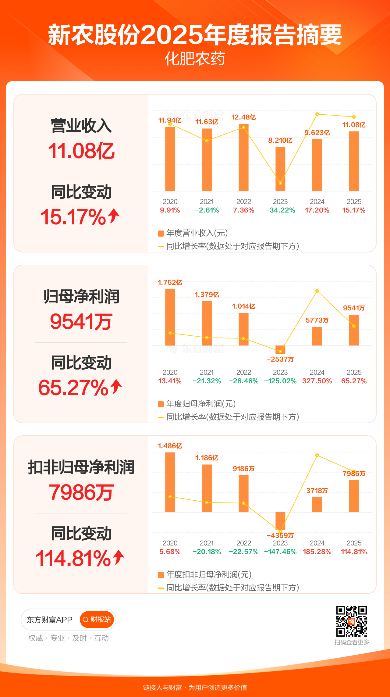 新农股份4月22日发布2025年年报显示,公司全年实现营业收入11.08亿元,同比增长15.17%;归母净利润9540.68万元,同比增长65.27%;扣非归母净利润7986.15万元,同比增长114.81%。