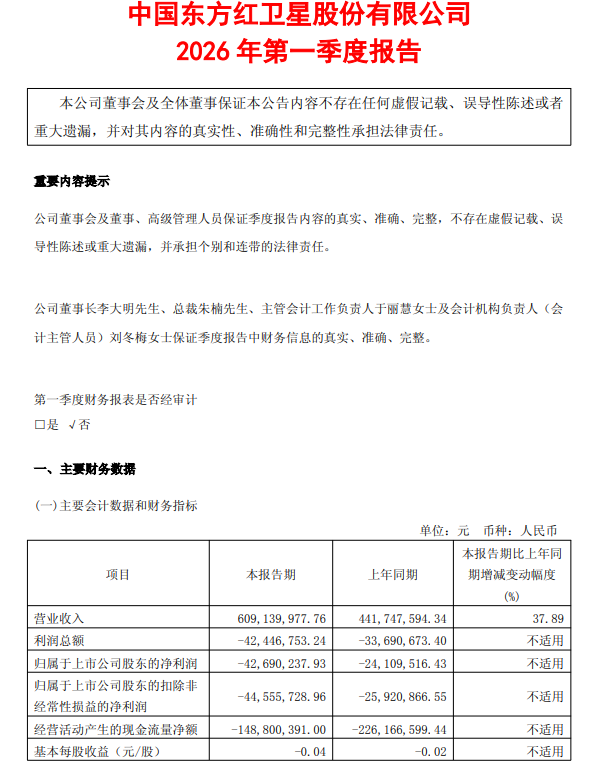 中国卫星(600118.SH)公告称,2026年第一季度实现营业收入6.09亿元,同比增长37.89%;归属于上市公司股东的净利润亏损4269.02万元。业绩变动原因系本报告期营业收入虽有所增加,但营业成本、期间费用、计提的资产减值损失较上年同期均有所增加,且其他收益中本期确认的增值税加计抵减额较上年同期减少。注:公司2025年Q4净利润2074.53万,据此计算,2026年Q1环比转亏。