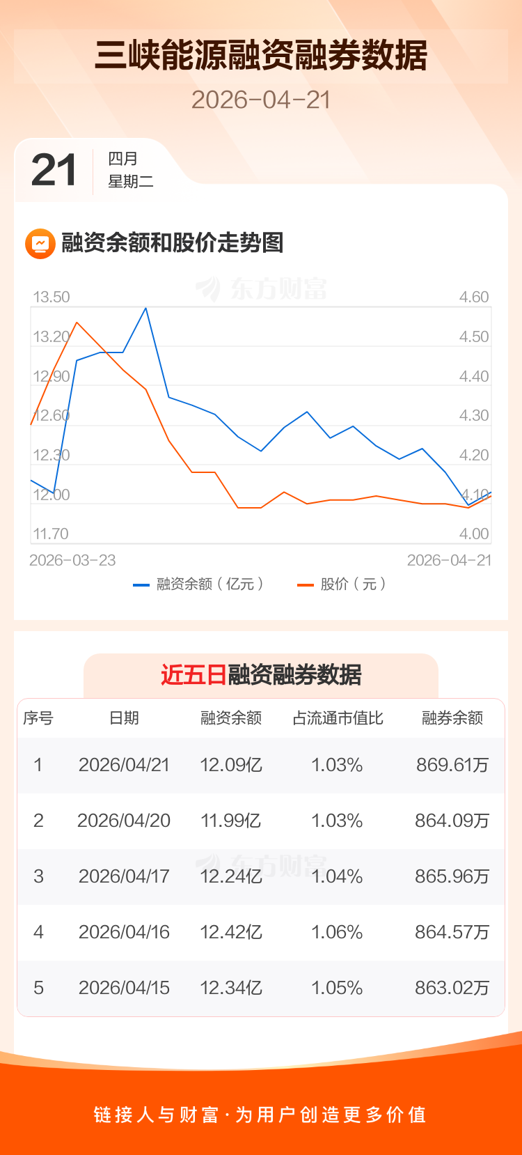 交易所最新数据显示,三峡能源于2026年4月21日获融资买入6398.48万元,融资偿还5396.65万元,当日融资净买入1001.84万元。目前,该股融资余额12.09亿,占流通市值比例为1.03%。