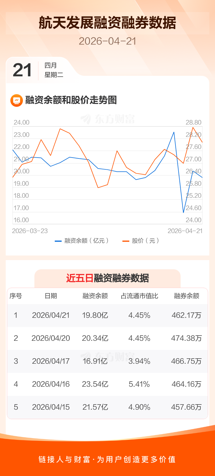 交易所最新数据显示,航天发展于2026年4月21日获融资买入5.36亿元,融资偿还5.91亿元,当日融资净偿还5446.69万元。目前,该股融资余额19.80亿,占流通市值比例为4.45%。