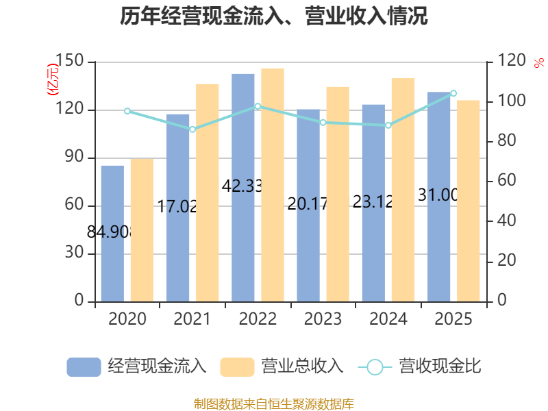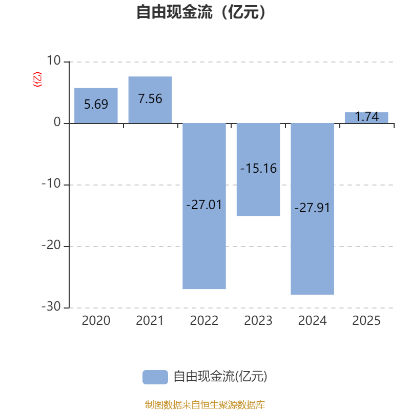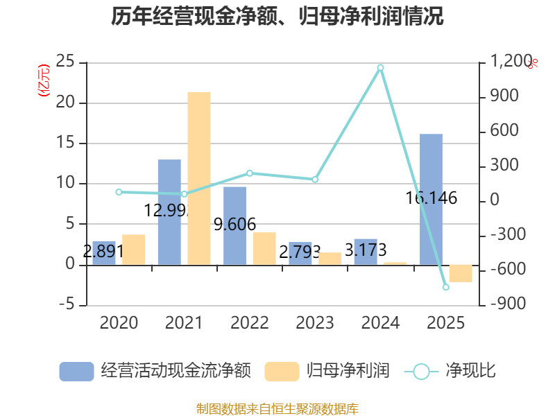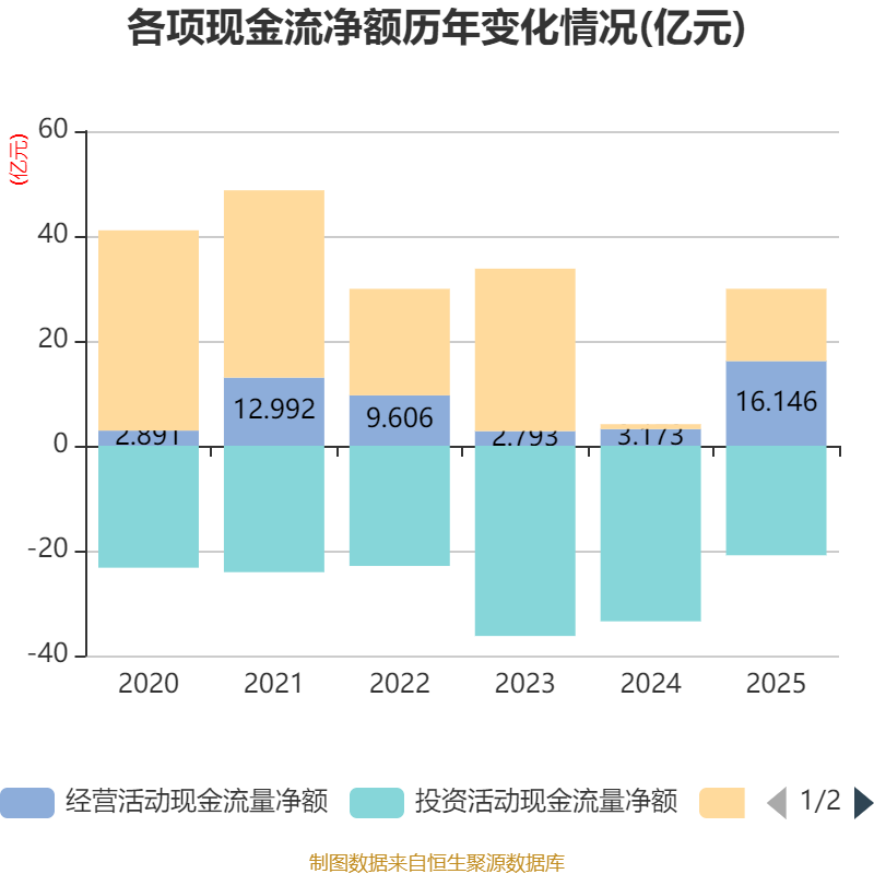 截至2025年,公司经营活动现金流净额为16.15亿元,同比增长408.88%;筹资活动现金流净额13.79亿元,同比增加12.84亿元;投资活动现金流净额-20.89亿元,上年同期为-33.48亿元。