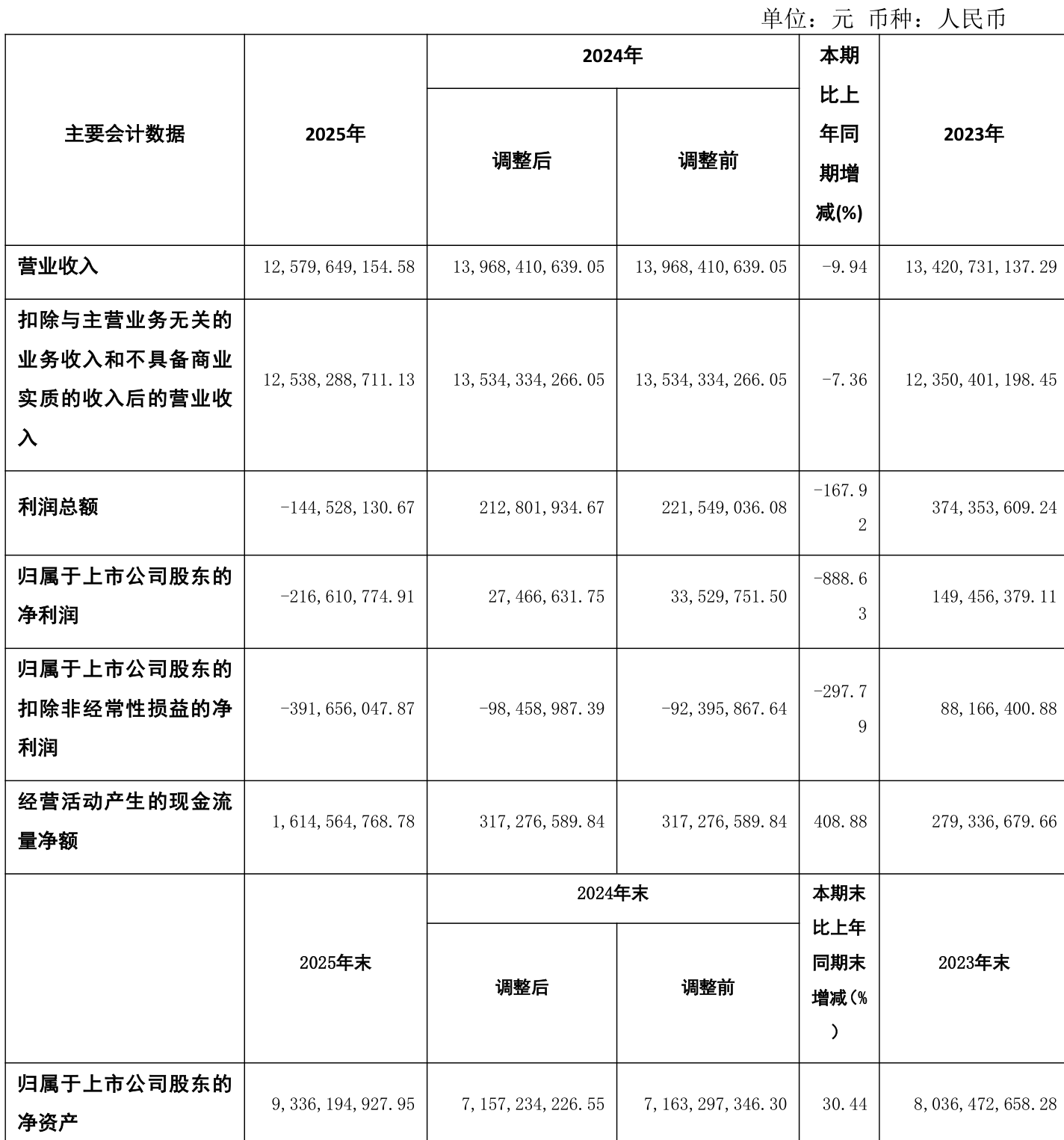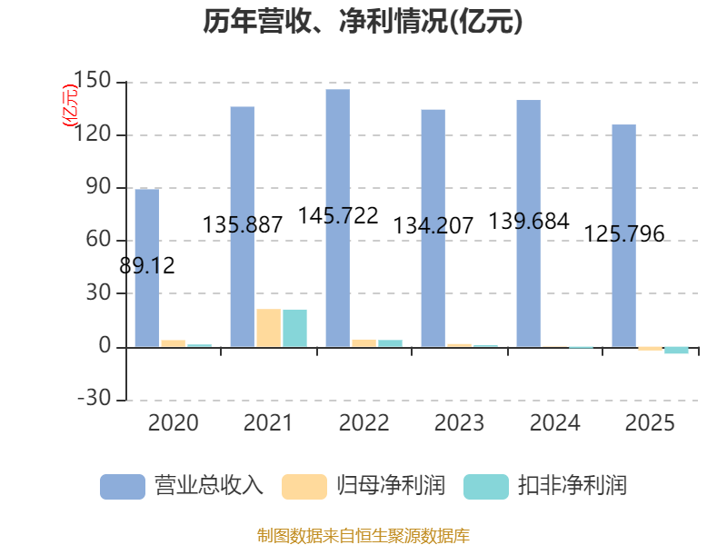 中证智能财讯神马股份(600810)4月22日披露2025年年度报告。2025年,公司实现营业总收入125.8亿元,同比下降9.94%;归母净利润亏损2.17亿元,上年同期盈利2746.66万元;扣非净利润亏损3.92亿元,上年同期亏损9845.9万元;经营活动产生的现金流量净额为16.15亿元,同比增长408.88%;报告期内,神马股份基本每股收益为-0.22元,加权平均净资产收益率为-3.07%。