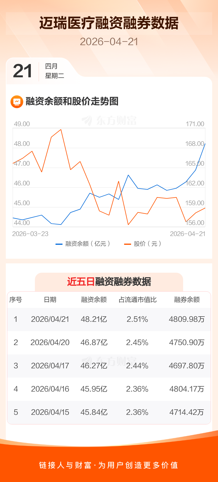 交易所最新数据显示,迈瑞医疗于2026年4月21日获融资买入2.55亿元,融资偿还1.21亿元,当日融资净买入1.34亿元。目前,该股融资余额48.21亿,占流通市值比例为2.51%。