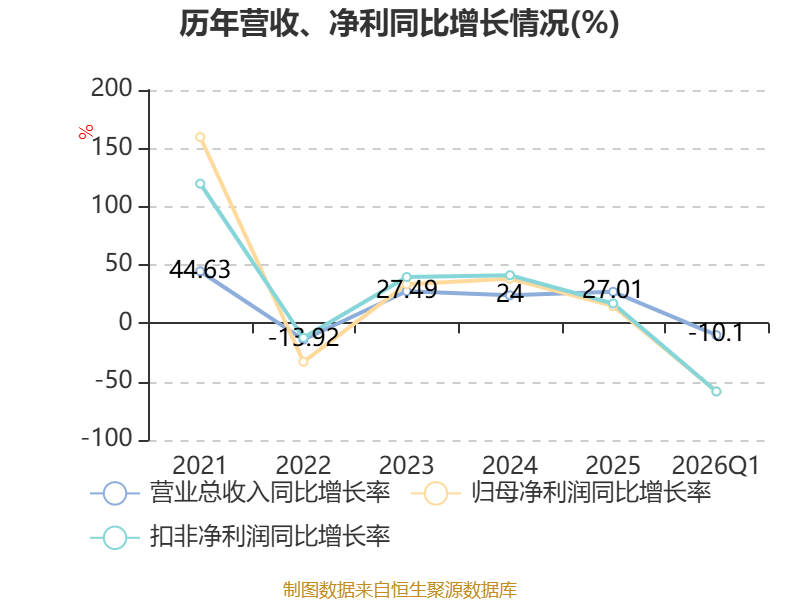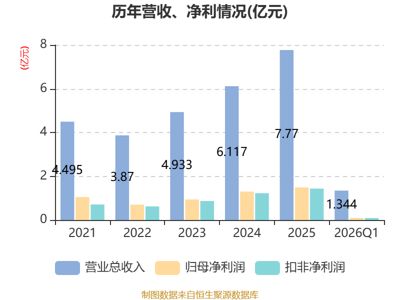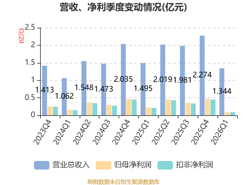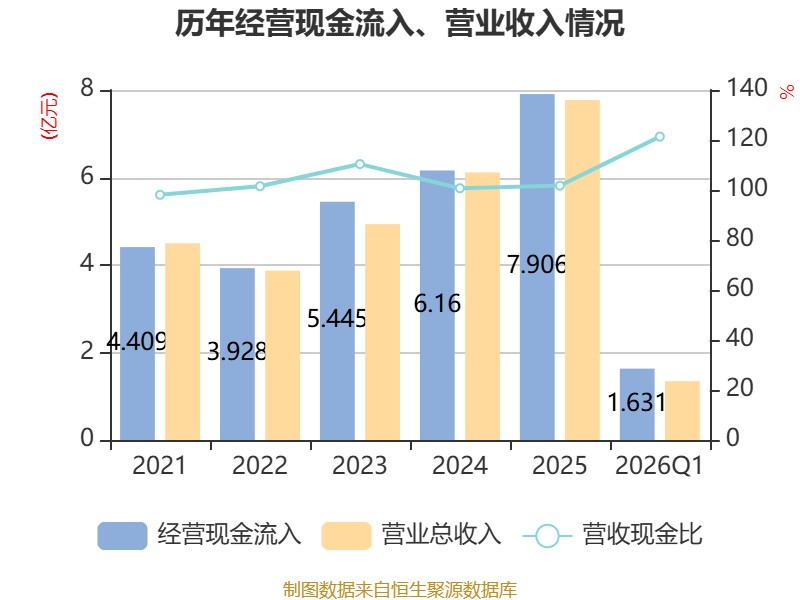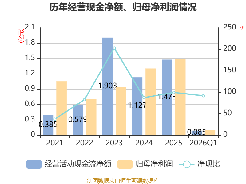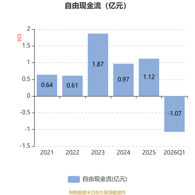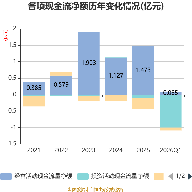 截至2026年一季度末,公司经营活动现金流净额为847.67万元,同比增加2912.48万元;筹资活动现金流净额-846.79万元,同比减少588.26万元;投资活动现金流净额-1亿元,上年同期为-275.69万元。