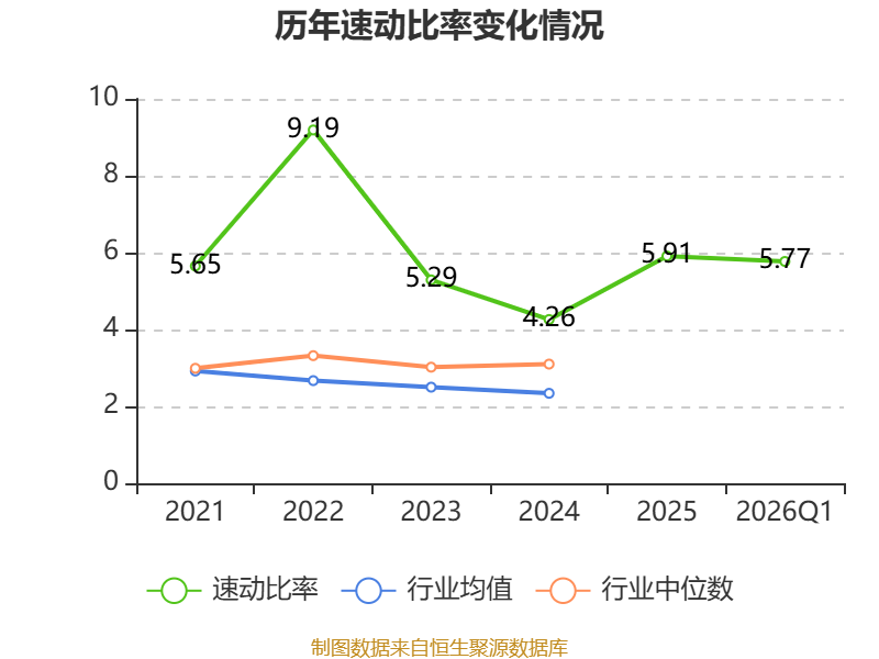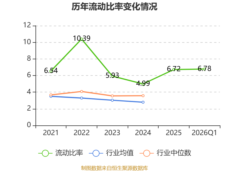 2026年第一季度,公司流动比率为6.78,速动比率为5.77。