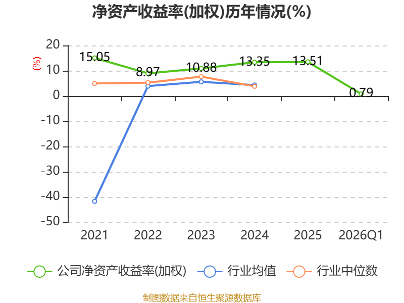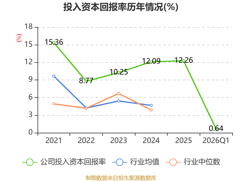 盈利能力方面, 2026年一季度公司加权平均净资产收益率为0.79%,同比下降1.32个百分点。公司2026年第一季度投入资本回报率为0.64%,较上年同期下降1.3个百分点。