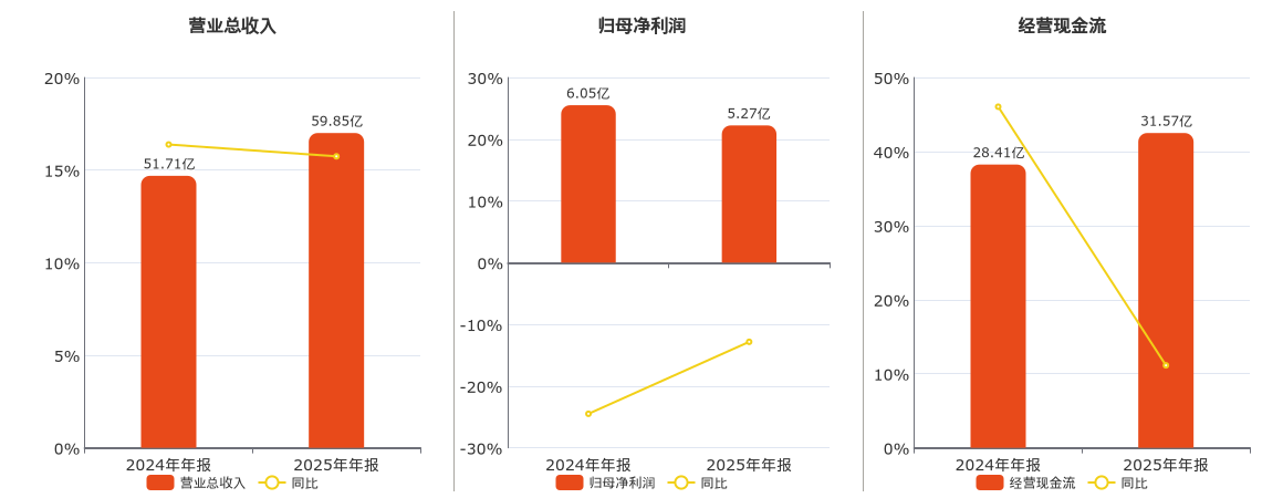 公司营业总收入为59.85亿元,在已披露的同业公司中排名第3,较去年同报告期营业总收入增加8.14亿元,实现5年连续上涨,同比去年同期上涨15.74%。归母净利润为5.27亿元,在已披露的同业公司中排名第6,较去年同报告期归母净利润减少7757.06万元,同比去年同期下降12.83%。经营活动现金净流入为31.57亿元,在已披露的同业公司中排名第3,较去年同报告期经营活动现金净流入增加3.16亿元,实现5年连续上涨,同比去年同期上涨11.13%。