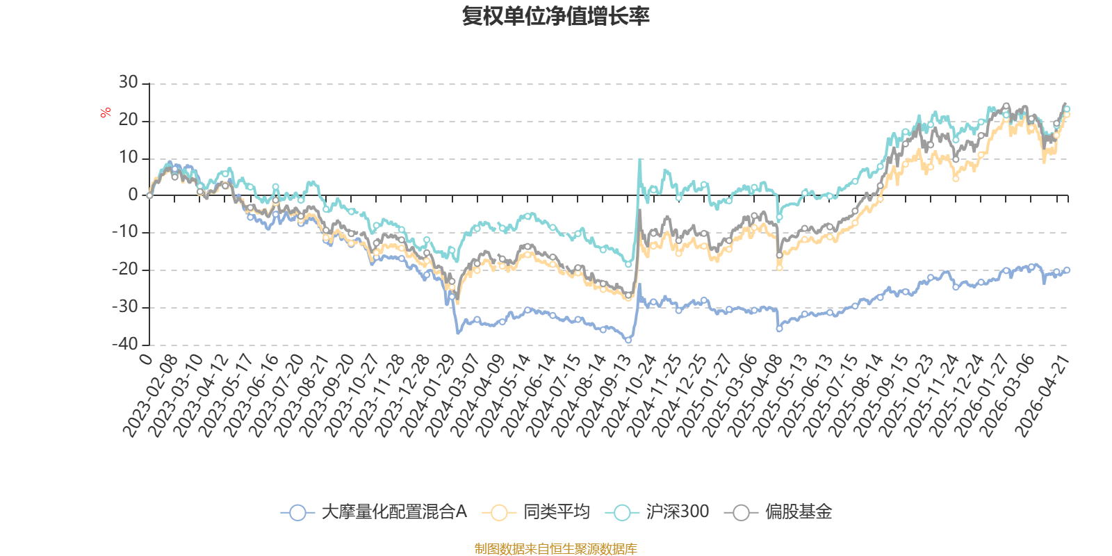 截至4月21日,大摩量化配置混合A近三个月复权单位净值增长率为0.57%,位于同类可比基金325/689;近半年复权单位净值增长率为3.94%,位于同类可比基金459/689;近一年复权单位净值增长率为19.98%,位于同类可比基金515/685;近三年复权单位净值增长率为-20.56%,位于同类可比基金395/422。
