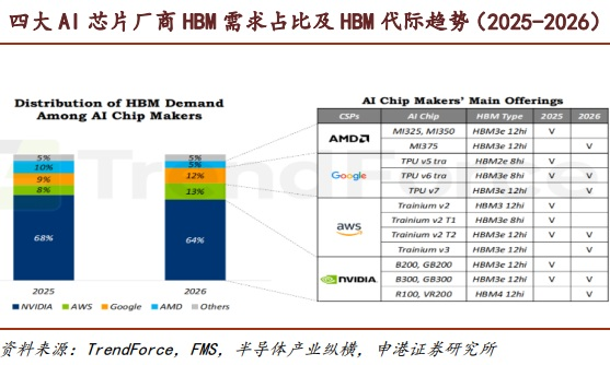 从市场格局来看,根据半导体产业纵横援引TrendForce数据,英伟达、AWS、谷歌和AMD四家AI芯片公司占据HBM需求的95%。