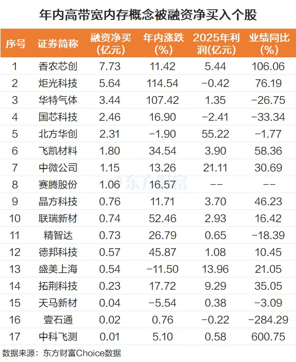个股而言,高带宽内存板块部分个股年内被杠杆资金积极买入。香农芯创年内被融资净买入7.73亿元。炬光科技紧随其后,被融资净买入5.64亿元。华特气体排在第三,被融资净买入3.44亿元。国芯科技、北方华创、飞凯材料、中微公司、赛腾股份也被融资净买入过亿。