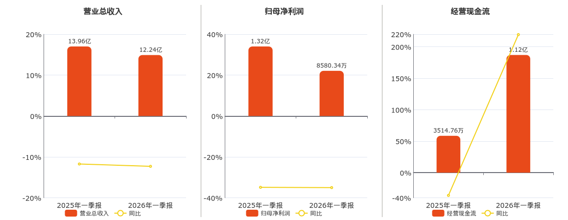 公司营业总收入为12.24亿元,较去年同报告期营业总收入减少1.72亿元,同比较去年同期下降12.30%。归母净利润为8580.34万元,较去年同报告期归母净利润减少4621.39万元,同比较去年同期下降35.01%。经营活动现金净流入为1.12亿元。