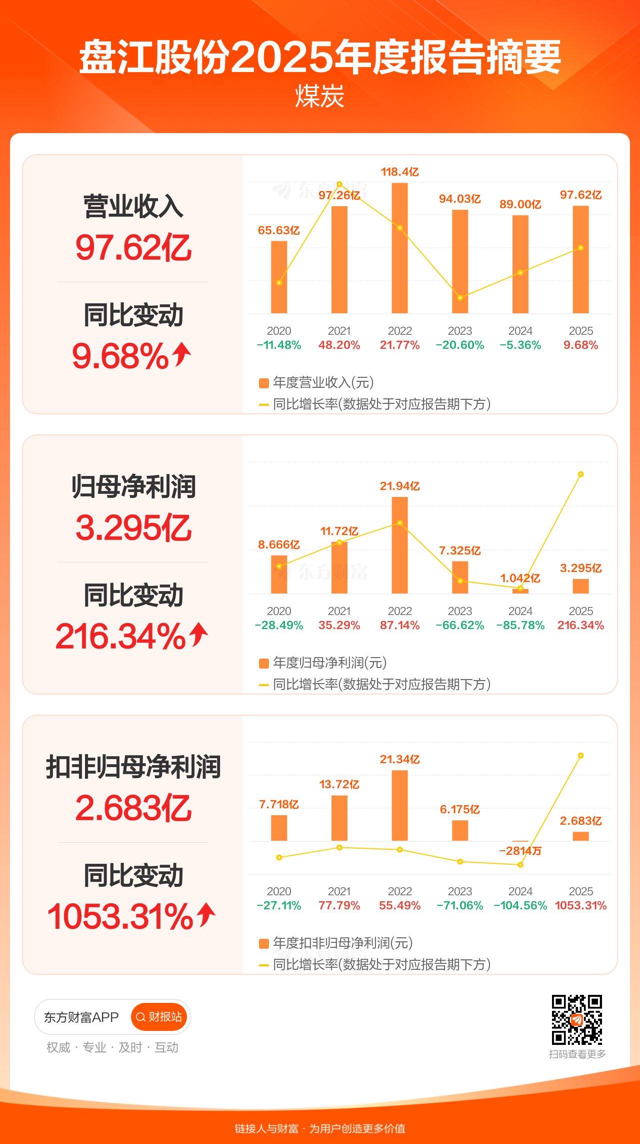盘江股份4月23日发布2025年年报显示,公司全年实现营业收入97.62亿元,同比增长9.68%;归母净利润3.29亿元,同比增长216.34%;扣非归母净利润2.68亿元,同比增长1053.31%。