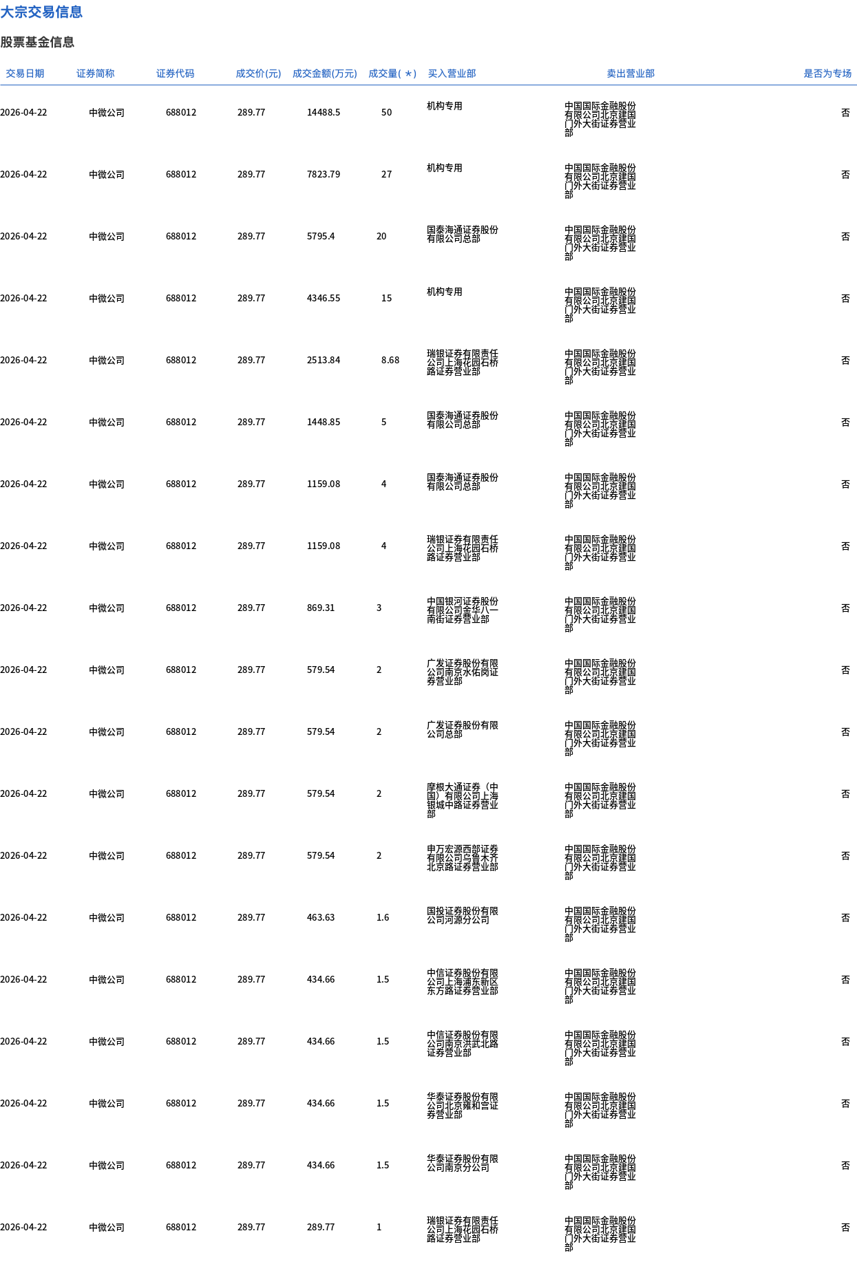 4月22日,中微公司大宗交易成交153.28万股,成交额4.44亿元,占当日总成交额的8.36%,成交价289.77元,较市场收盘价319.99元折价9.44%。