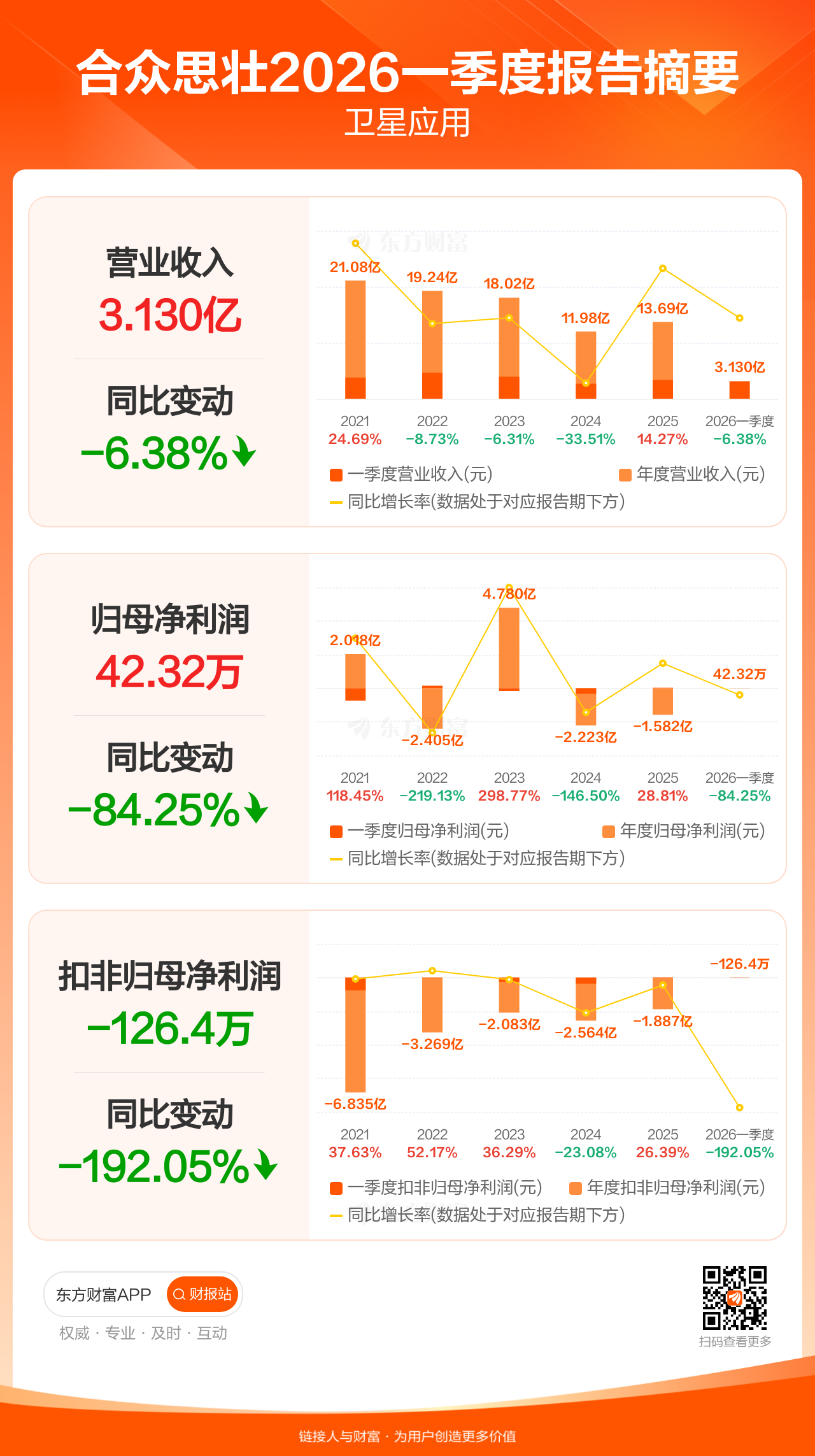 合众思壮4月23日发布2026年一季报显示,公司一季度实现营业收入3.13亿元,同比下滑6.38%;归母净利润42.32万元,同比下滑84.25%;扣非归母净利润-126.44万元。