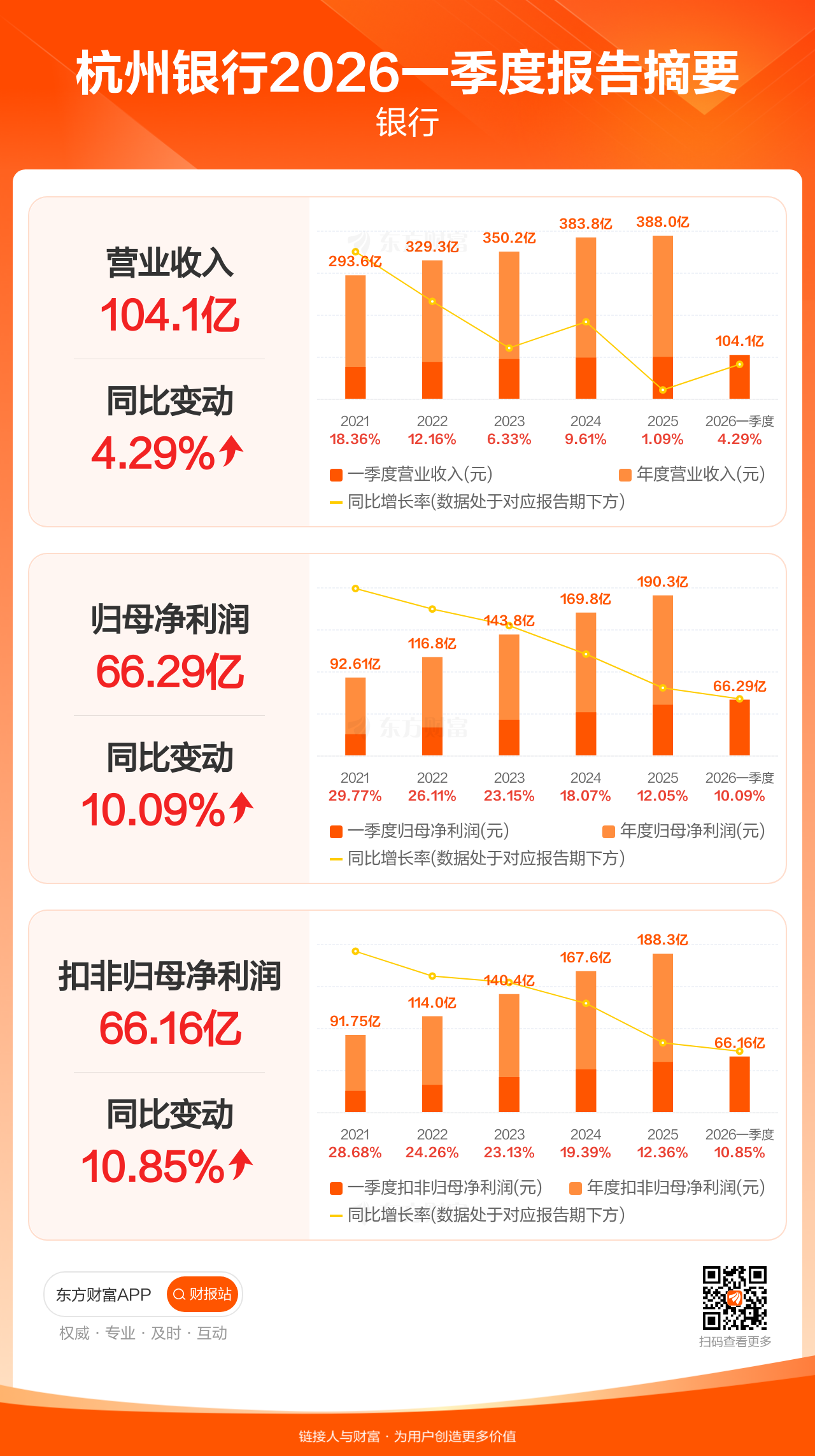 杭州银行4月23日发布2026年一季报显示,公司一季度实现营业收入104.06亿元,同比增长4.29%;归母净利润66.29亿元,同比增长10.09%;扣非归母净利润66.16亿元,同比增长10.85%。