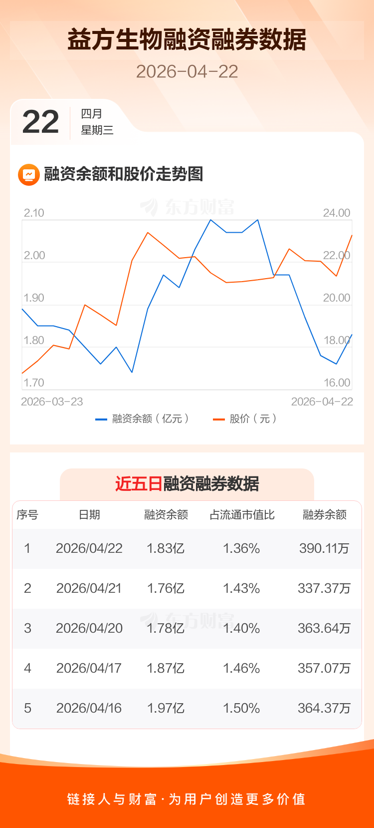 交易所最新数据显示,益方生物于2026年4月22日获融资买入3491.07万元,融资偿还2782.22万元,当日融资净买入708.85万元。目前,该股融资余额1.83亿,占流通市值比例为1.36%。