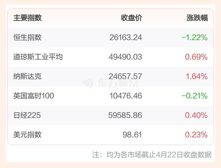 美股市场:截止4月22日收盘,美股三大指数全线上涨。消息面上,美国总统特朗普22日在接受福克斯新闻频道记者采访时说,何时结束同伊朗的冲突目前“没有时间表”,也无需着急。特朗普说:“有人说我是为了中期选举才急于结束这场冲突,但这绝非事实。”他还说,此前关于延长停火存在“3到5天窗口期”的报道“不属实”,并称关于停火“没有任何时间压力”。