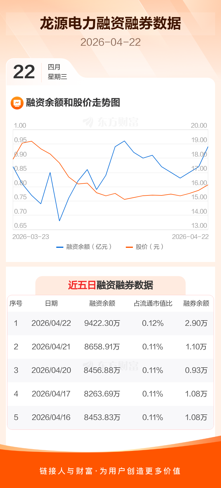 交易所最新数据显示,龙源电力于2026年4月22日获融资买入2119.82万元,融资偿还1356.42万元,当日融资净买入763.39万元。目前,该股融资余额9422.30万,占流通市值比例为0.12%。