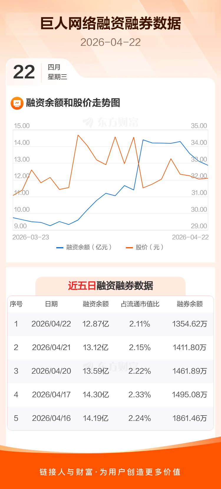 交易所最新数据显示,巨人网络于2026年4月22日获融资买入8197.89万元,融资偿还1.07亿元,当日融资净偿还2494.13万元。目前,该股融资余额12.87亿,占流通市值比例为2.11%。