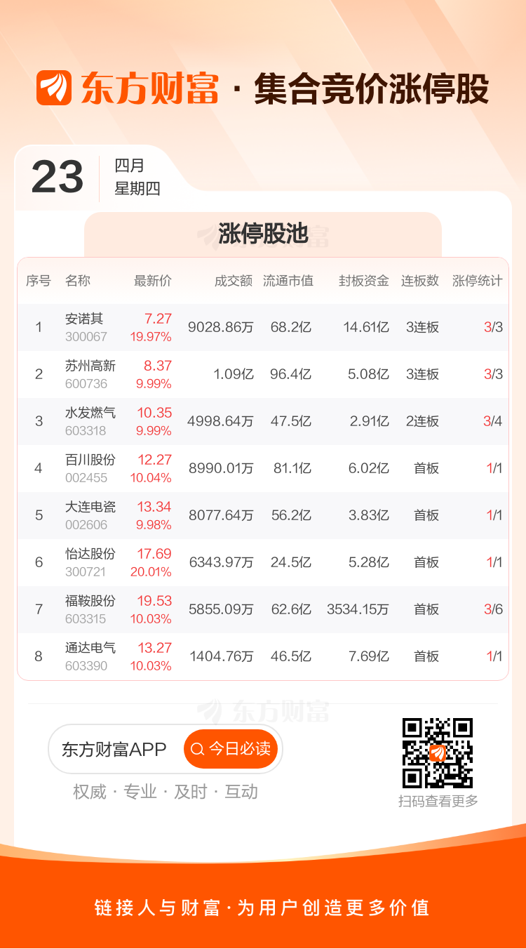 个股方面,8股竞价涨停,其中安诺其3连板、苏州高新3连板、水发燃气2连板、百川股份首板、大连电瓷首板。