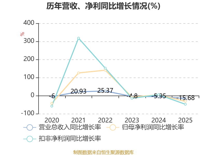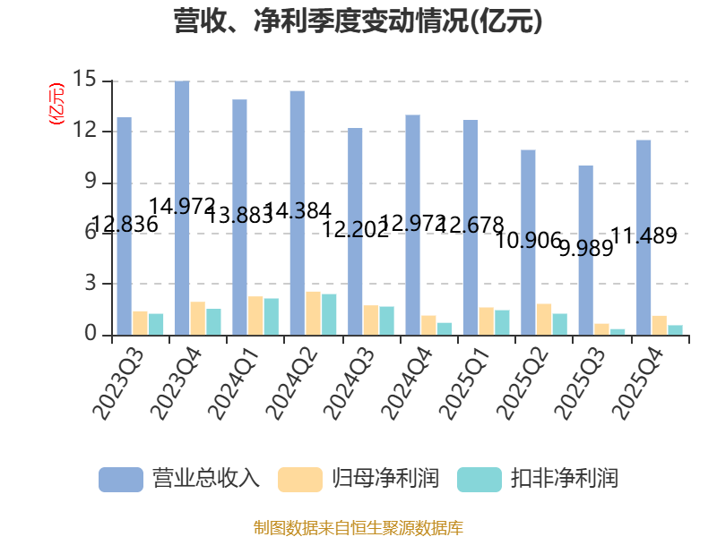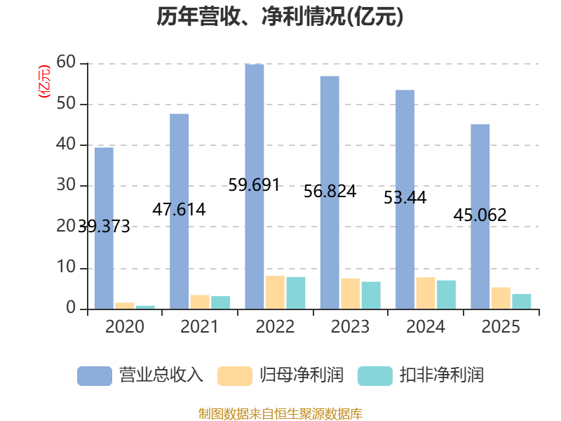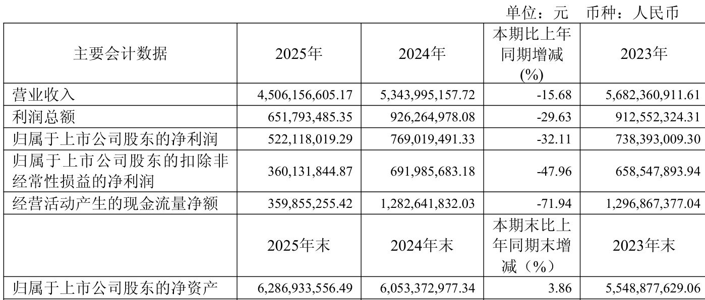 中证智能财讯苏盐井神(603299)4月23日披露2025年年度报告。2025年,公司实现营业总收入45.06亿元,同比下降15.68%;归母净利润5.22亿元,同比下降32.11%;扣非净利润3.6亿元,同比下降47.96%;经营活动产生的现金流量净额为3.6亿元,同比下降71.94%;报告期内,苏盐井神基本每股收益为0.668元,加权平均净资产收益率为8.46%。公司2025年度分配预案为:拟向全体股东每10股派现2.52元(含税)。