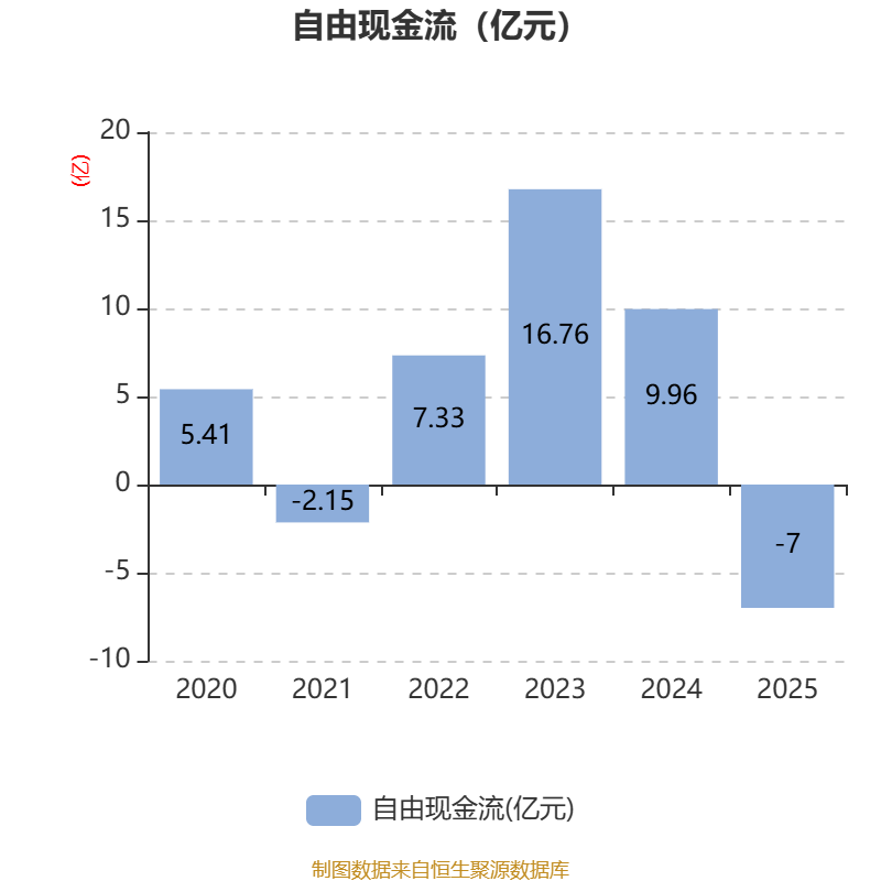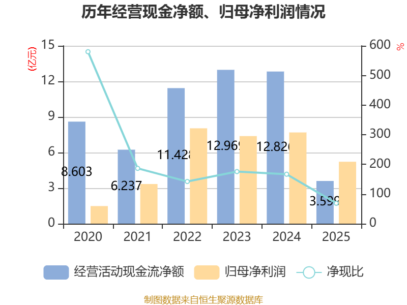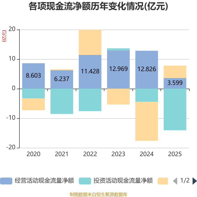 截至2025年,公司经营活动现金流净额为3.6亿元,同比下降71.94%;筹资活动现金流净额4.2亿元,同比增加17.42亿元;投资活动现金流净额-14.07亿元,上年同期为-4.42亿元。