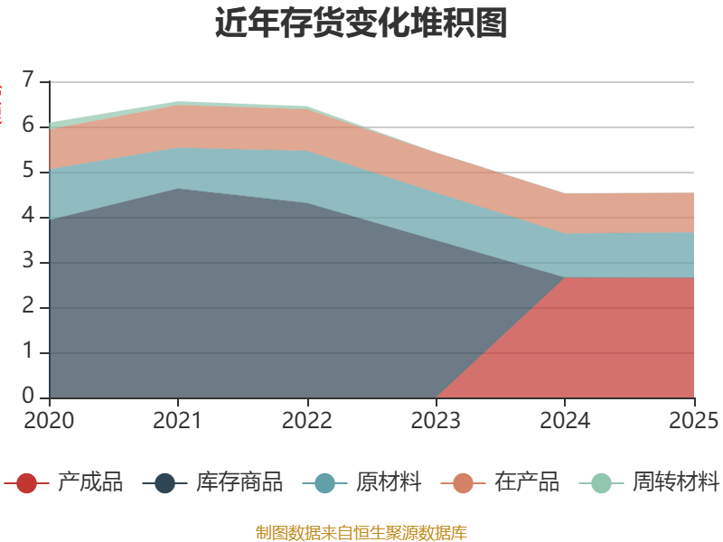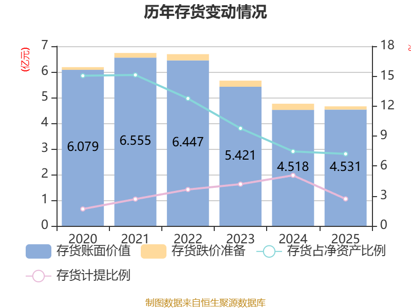 从存货变动来看,截至2025年末,公司存货账面价值为4.53亿元,占净资产的7.21%,较上年末增加131.59万元。其中,存货跌价准备为1256.19万元,计提比例为2.7%。