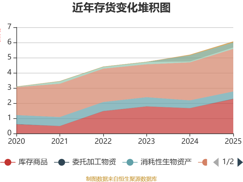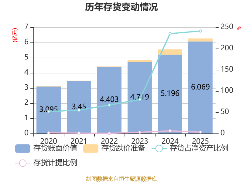 从存货变动来看,截至2025年末,公司存货账面价值为6.07亿元,占净资产的241.23%,较上年末增加8725.53万元。其中,存货跌价准备为1955.48万元,计提比例为3.12%。