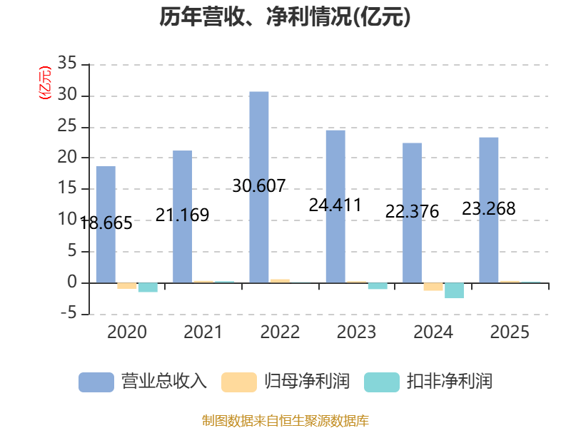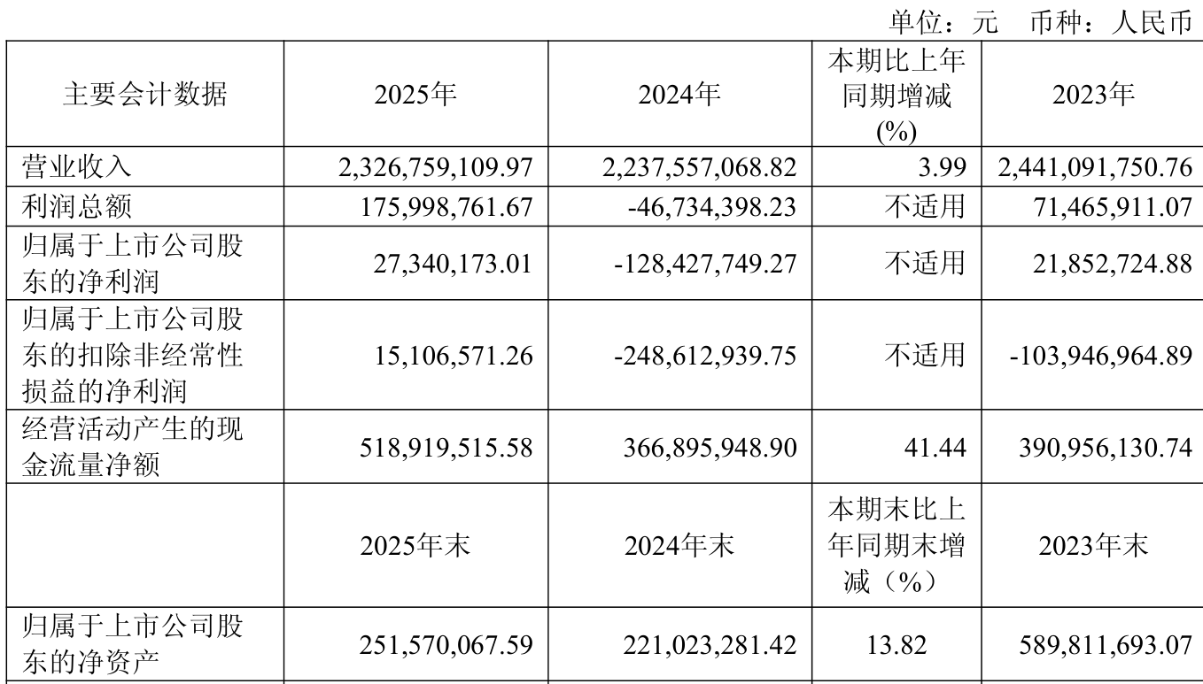 中证智能财讯宜宾纸业(600793)4月23日披露2025年年度报告。2025年,公司实现营业总收入23.27亿元,同比增长3.99%;归母净利润2734.02万元,同比扭亏;扣非净利润1510.66万元,同比扭亏;经营活动产生的现金流量净额为5.19亿元,同比增长41.44%;报告期内,宜宾纸业基本每股收益为0.1545元,加权平均净资产收益率为11.58%。