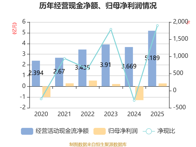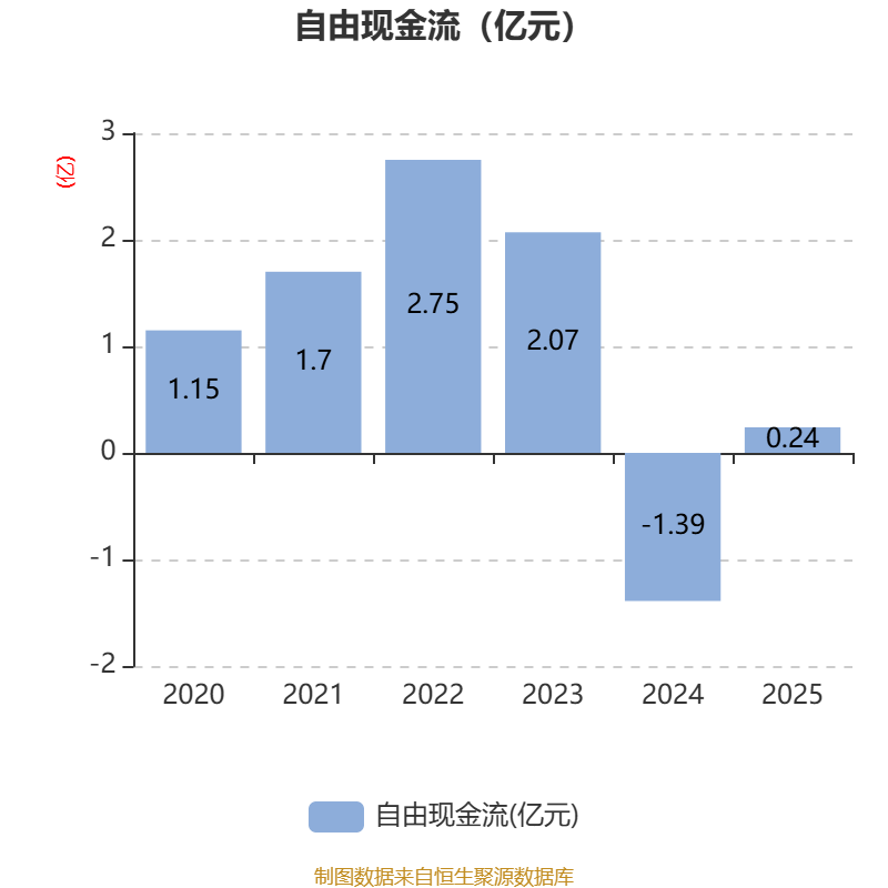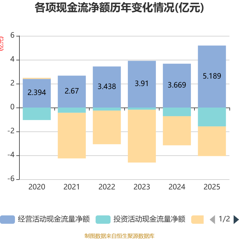 截至2025年,公司经营活动现金流净额为5.19亿元,同比增长41.44%;筹资活动现金流净额-2.48亿元,同比减少459.87万元;投资活动现金流净额-1.58亿元,上年同期为-7227.45万元。