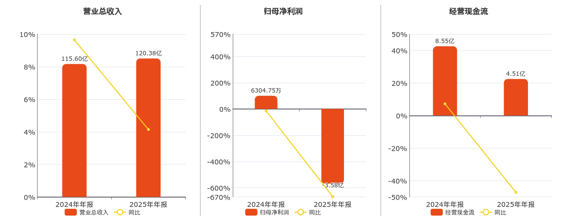公司营业总收入为120.38亿元。归母净利润为-3.58亿元,较去年同报告期归母净利润减少4.21亿元,同比较去年同期下降668.07%。经营活动现金净流入为4.51亿元,较去年同报告期经营活动现金净流入减少4.04亿元,同比较去年同期下降47.24%。