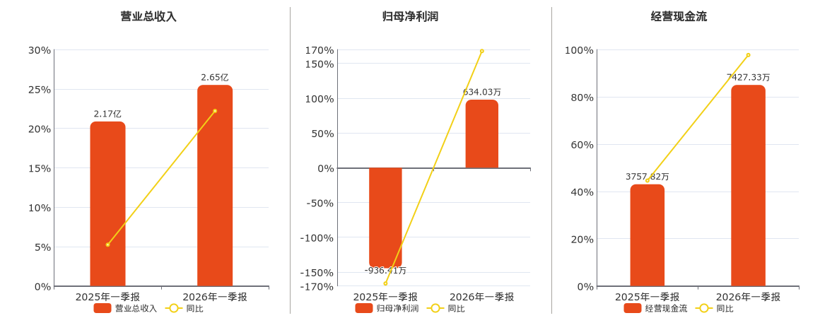 公司营业总收入为2.65亿元,较去年同报告期营业总收入增加4812.09万元,实现4年连续上涨,同比较去年同期上涨22.20%。归母净利润为634.03万元,较去年同报告期归母净利润增加1570.43万元。经营活动现金净流入为7427.33万元,较去年同报告期经营活动现金净流入增加3669.51万元,实现2年连续上涨,同比较去年同期上涨97.65%。