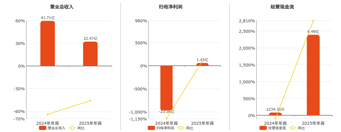 公司营业总收入为22.47亿元,在已披露的同业公司中排名第34,较去年同报告期营业总收入减少19.24亿元,同比较去年同期下降46.13%。归母净利润为1.43亿元。经营活动现金净流入为6.49亿元。