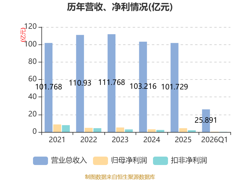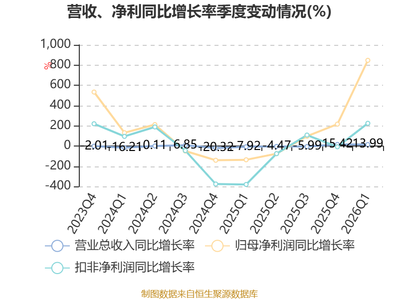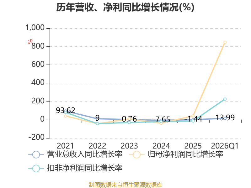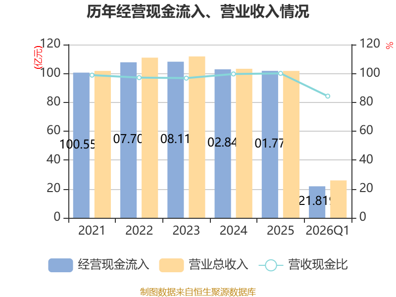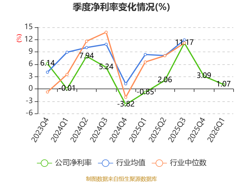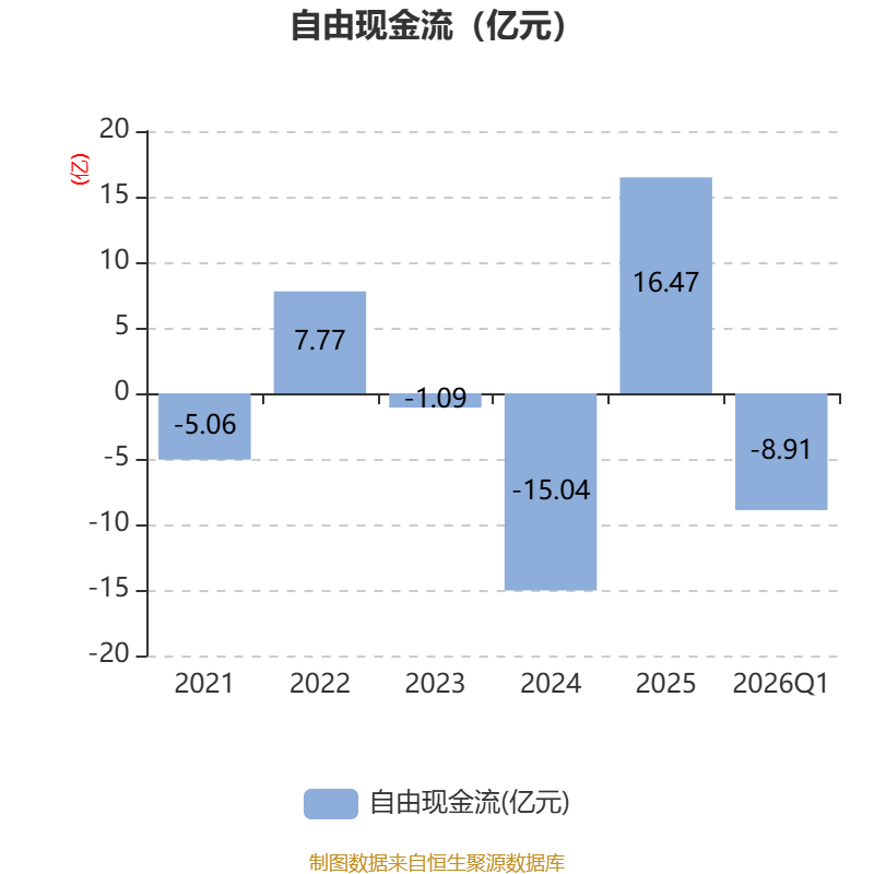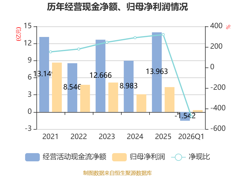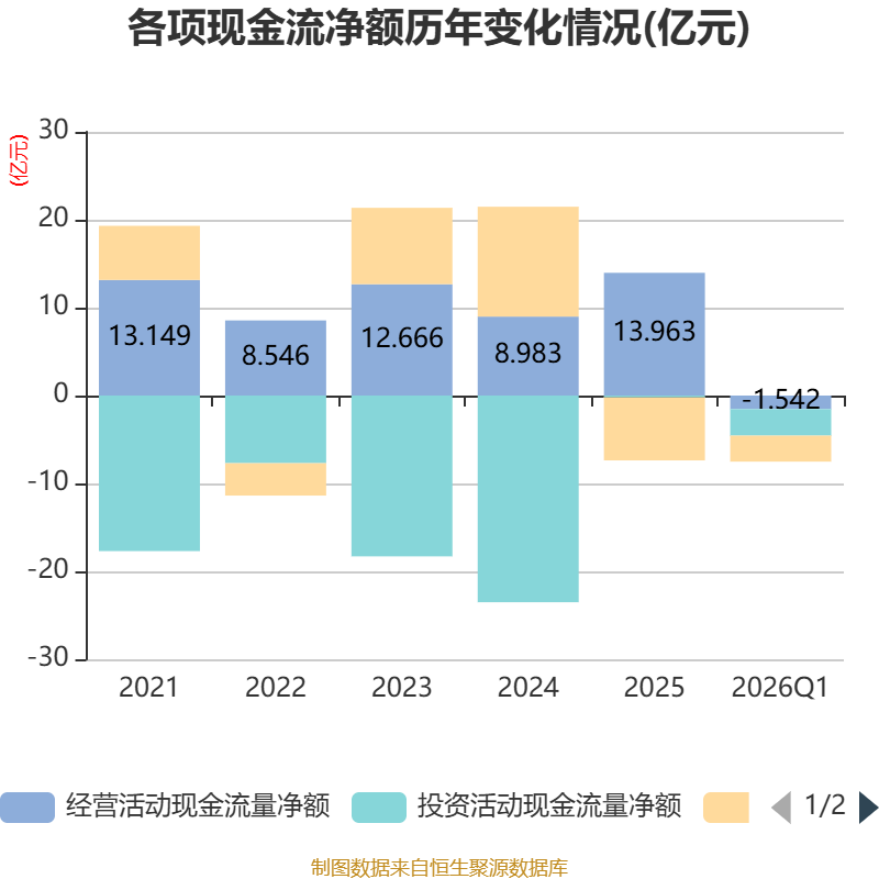 截至2026年一季度末,公司经营活动现金流净额为-1.54亿元,同比减少2.78亿元;筹资活动现金流净额-2.96亿元,同比减少6.49亿元;投资活动现金流净额-3.02亿元,上年同期为-3.71亿元。
