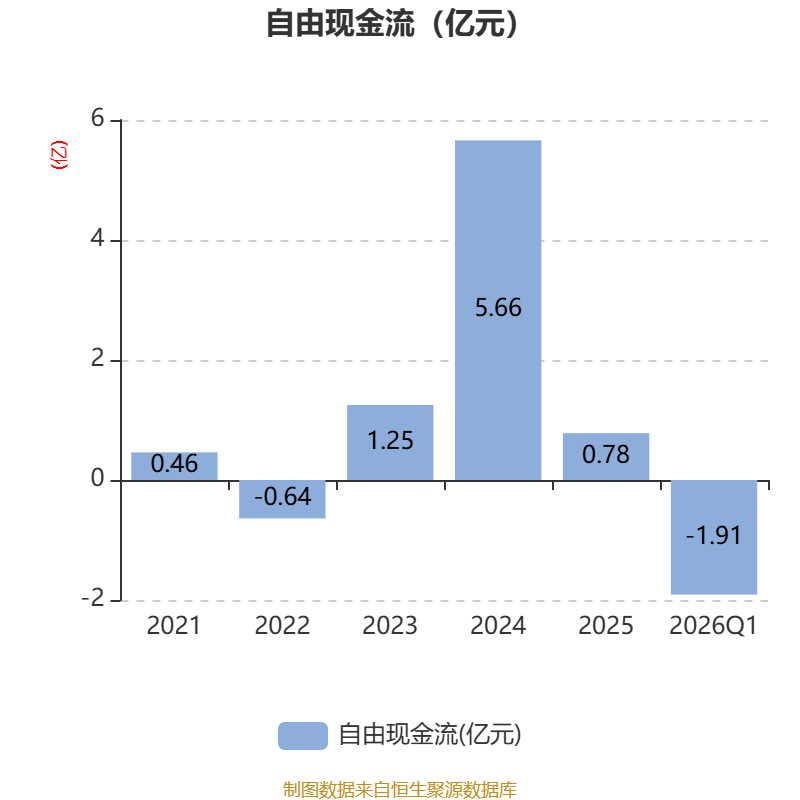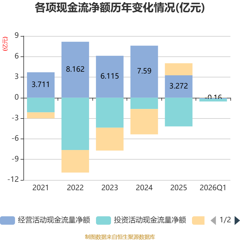 截至2026年一季度末,公司经营活动现金流净额为-1598.41万元,同比减少8867.25万元;筹资活动现金流净额497.9万元,同比减少6132.41万元;投资活动现金流净额-3877.98万元,上年同期为-1.6亿元。