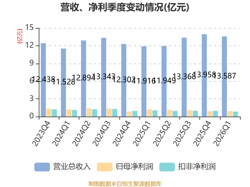 中证智能财讯建霖家居(603408)4月23日披露2026年第一季度报告。公司实现营业总收入13.59亿元,同比增长14.02%;归母净利润9431.22万元,同比下降23.56%;扣非净利润8484.06万元,同比下降20.38%;经营活动产生的现金流量净额为-1598.41万元,上年同期为7268.84万元;报告期内,建霖家居基本每股收益为0.21元,加权平均净资产收益率为2.69%。
