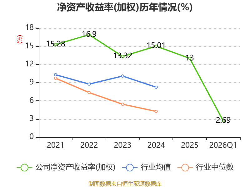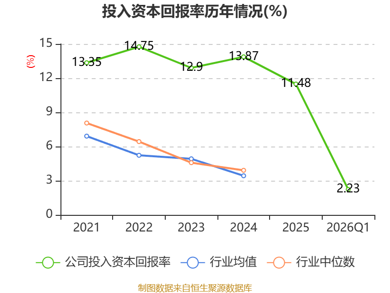 盈利能力方面, 2026年一季度公司加权平均净资产收益率为2.69%,同比下降1个百分点。公司2026年第一季度投入资本回报率为2.23%,较上年同期下降1.17个百分点。