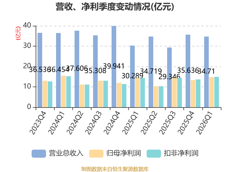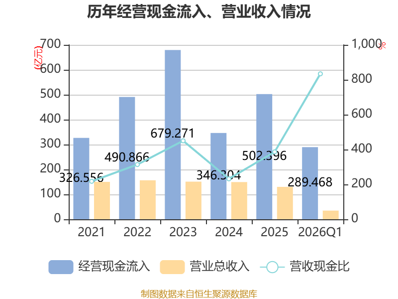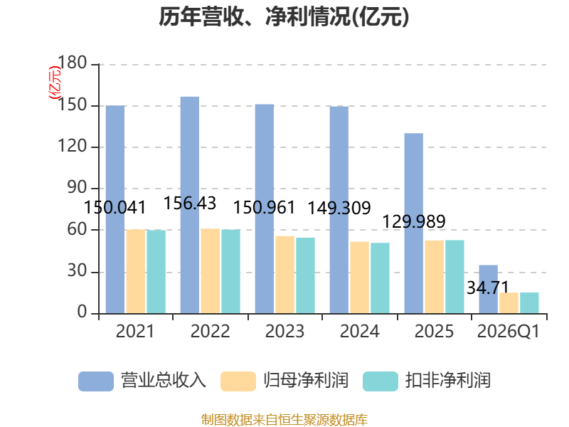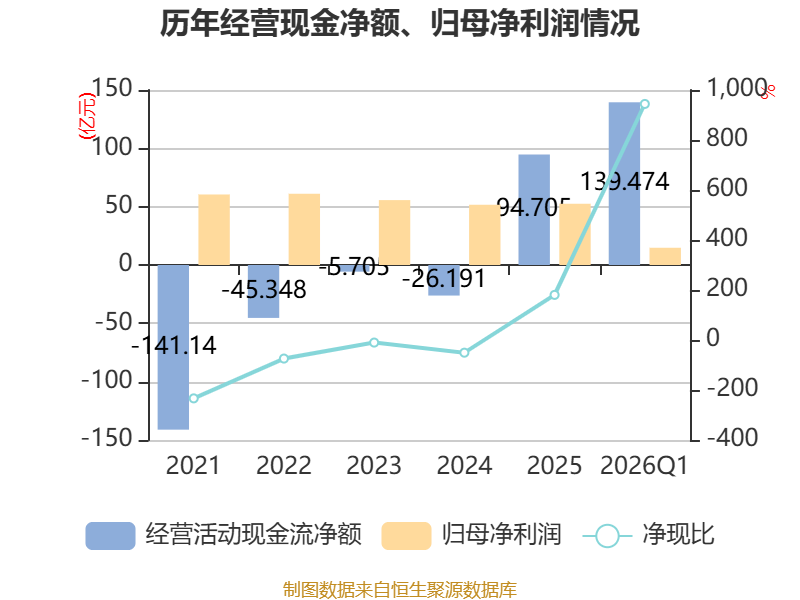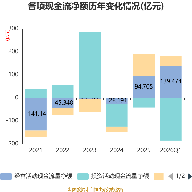 截至2026年一季度末,公司经营活动现金流净额为139.47亿元,同比下降53.99%;筹资活动现金流净额41.31亿元,同比增加19.75亿元;投资活动现金流净额-185.31亿元,上年同期为-215.24亿元。