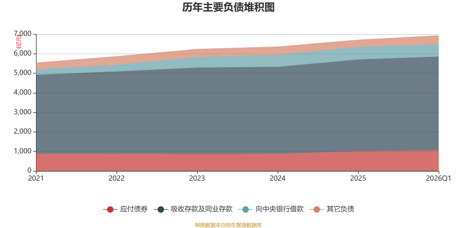 负债重大变化方面,截至2026年一季度末,公司卖出回购金融资产款较上年末增加627.47%,占公司总资产比重上升1.26个百分点;向中央银行借款较上年末减少4.57%,占公司总资产比重下降0.65个百分点;吸收存款及同业存款较上年末增加2.27%,占公司总资产比重下降0.56个百分点;拆入资金较上年末减少1.29%,占公司总资产比重下降0.18个百分点。