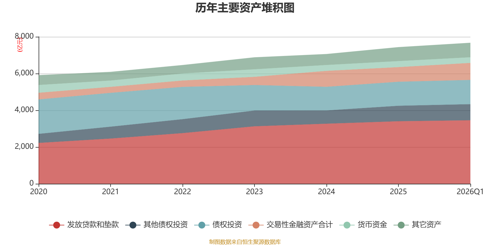 资产重大变化方面,截至2026年一季度末,公司交易性金融资产合计较上年末增加16.3%,占公司总资产比重上升1.36个百分点;发放贷款和垫款较上年末增加1.53%,占公司总资产比重下降0.73个百分点;货币资金较上年末减少6.67%,占公司总资产比重下降0.43个百分点;债权投资较上年末增加0.93%,占公司总资产比重下降0.38个百分点。