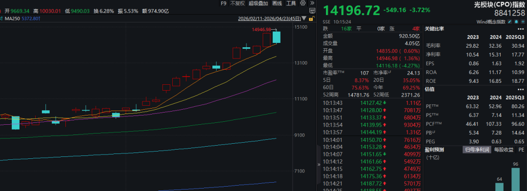 在中际旭创股价和市值再度上行之际,表征该板块走势的万得光模块(CPO)概念指数亦整体上行,盘中指数和整个板块市值再创历史新高,不过后来出现“恐高”情绪,出现一波跳水。