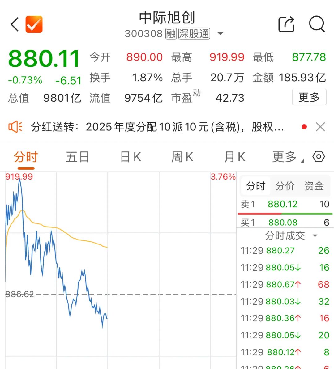 4月23日,CPO概念龙头中际旭创盘中一度涨超3%,股价最高涨至919.99元/股,总市值一度突破万亿元。随后其股价大幅下跌,截至午间收盘,跌0.73%,成交额185.93亿元,位居A股第一。