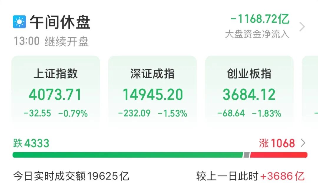 4月23日早盘,A股震荡走低。截至午间收盘,上证指数报4073.71点,跌0.79%;深证成指跌1.53%,创业板指跌1.83%,科创综指跌2.74%。沪深北三市半日成交19625亿元,较上个交易日同期放量3686亿元。