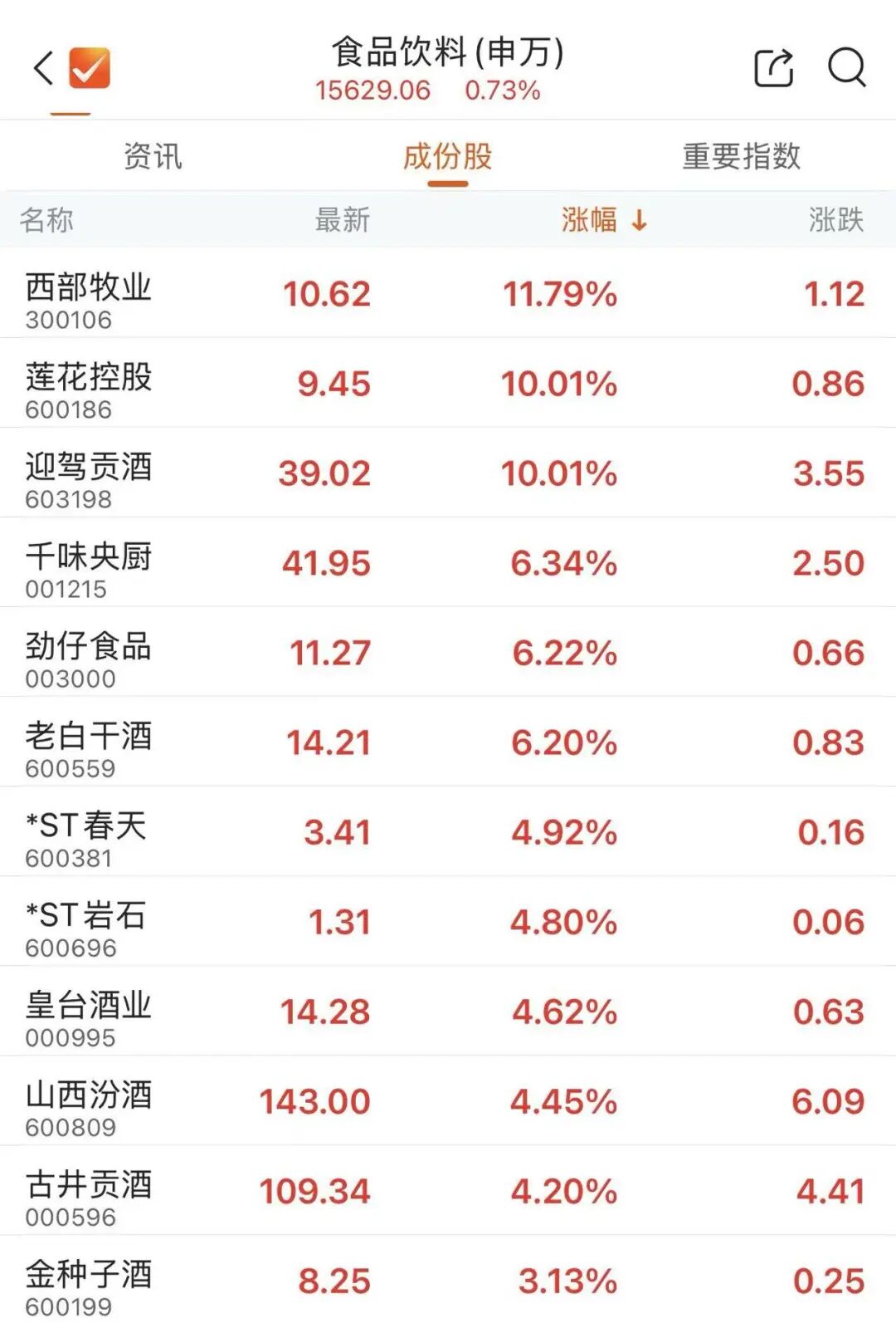 早盘,大消费股迎来反弹。食品饮料、白酒、零售等方向纷纷上涨。食品饮料板块中,西部牧业涨超10%,莲花控股涨停。