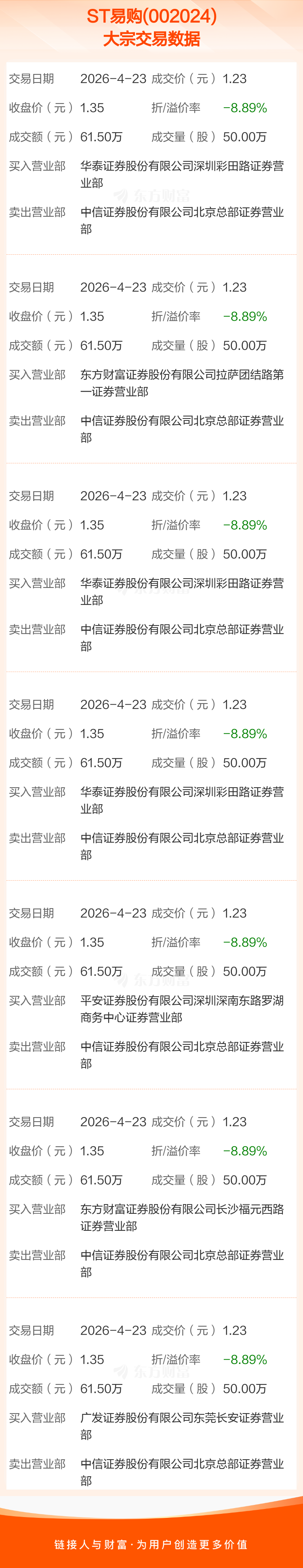 2026年4月23日,ST易购发生7笔大宗交易,共成交350.00万股,成交金额430.50万元,占其流通市值比例为0.03%。