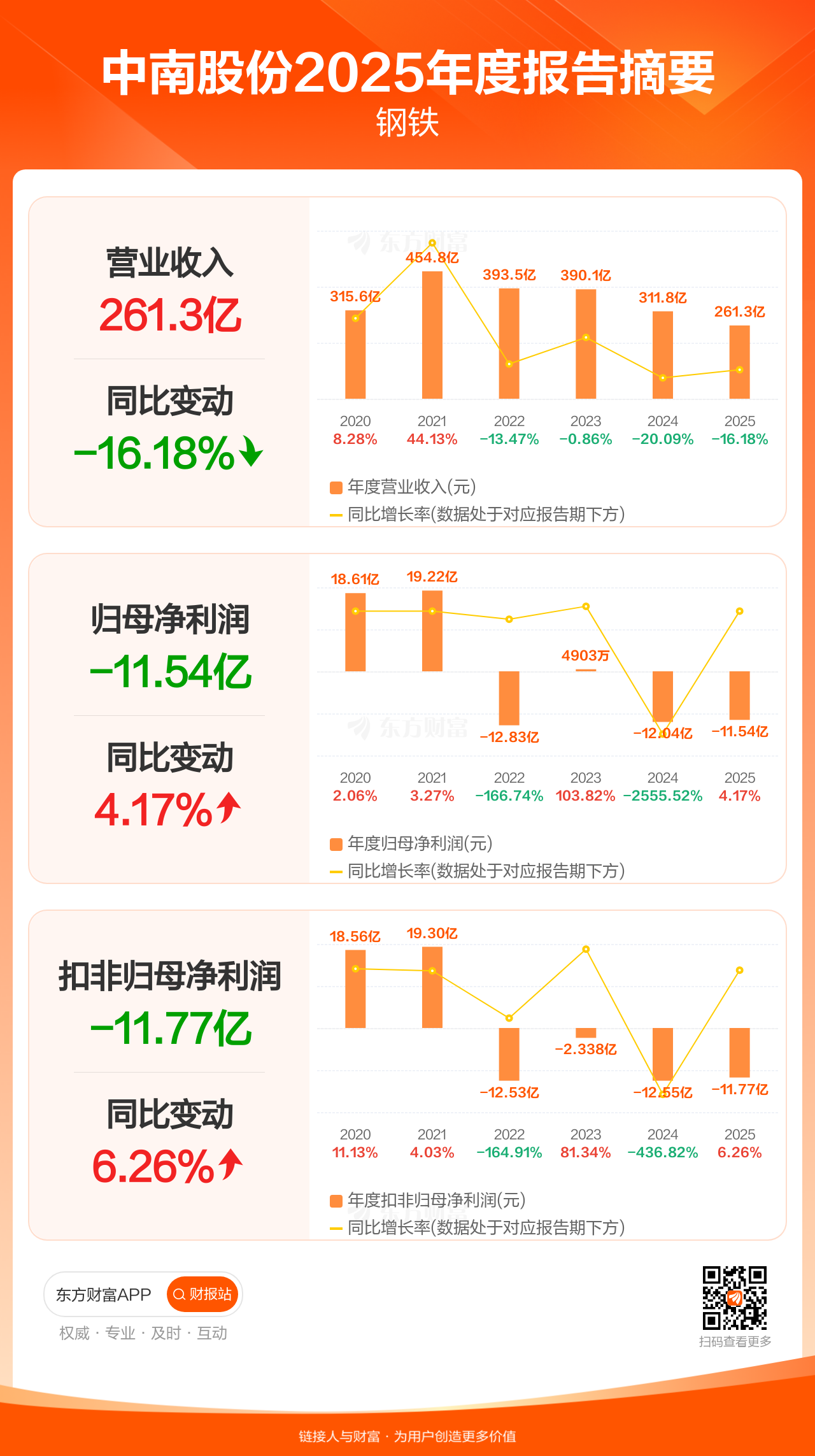 中南股份4月24日发布2025年年报显示,公司全年实现营业收入261.31亿元,同比下滑16.18%;归母净利润-11.54亿元;扣非归母净利润-11.77亿元。