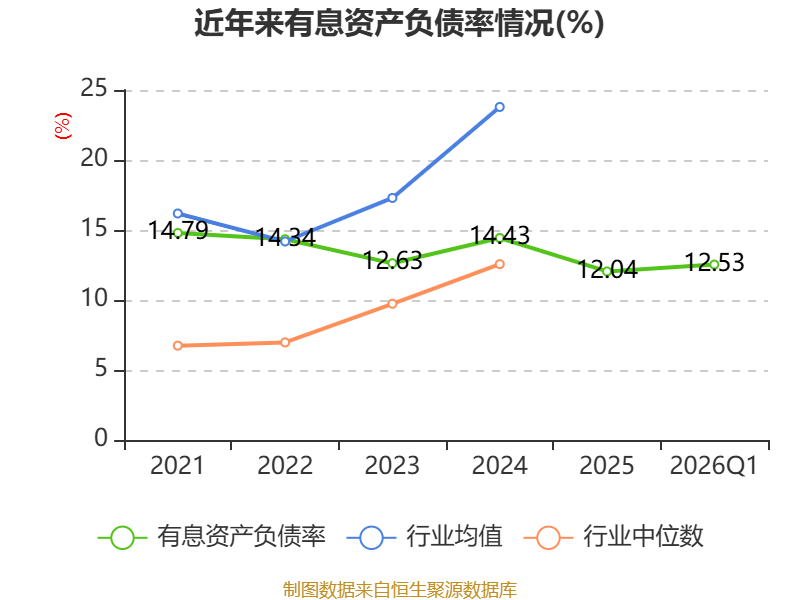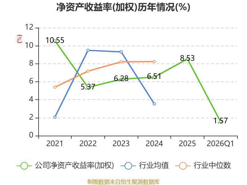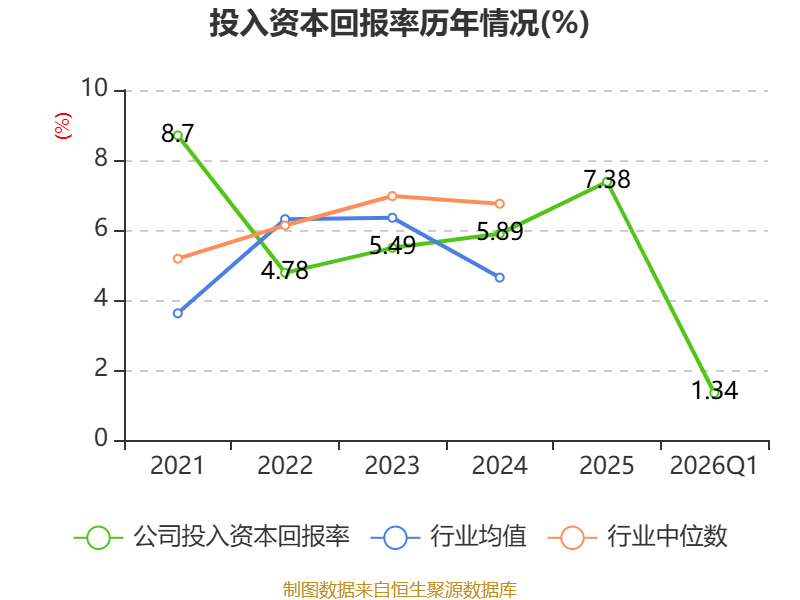 盈利能力方面, 2026年一季度公司加权平均净资产收益率为1.57%,同比下降0.88个百分点。公司2026年第一季度投入资本回报率为1.34%,较上年同期下降0.76个百分点。