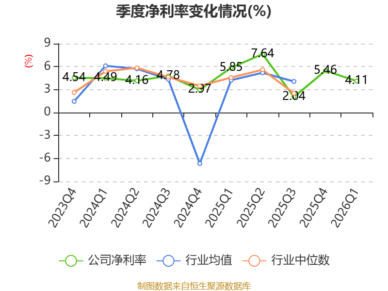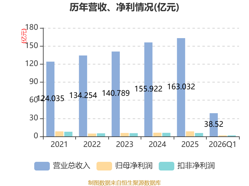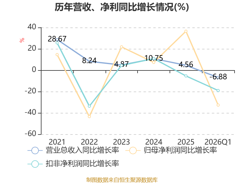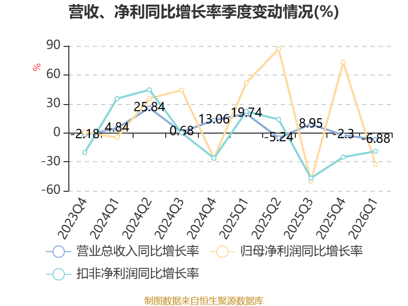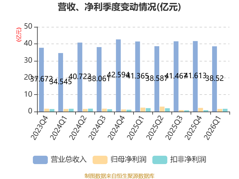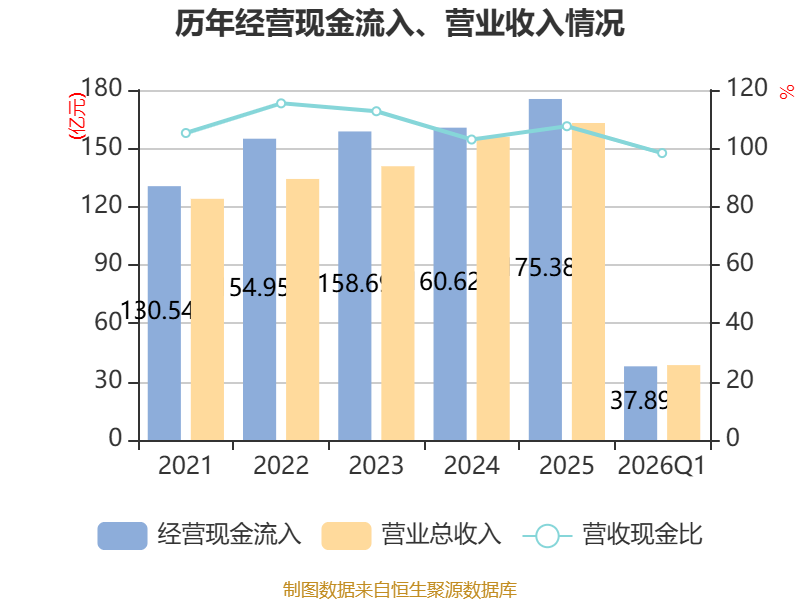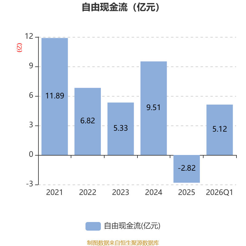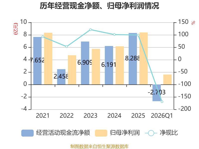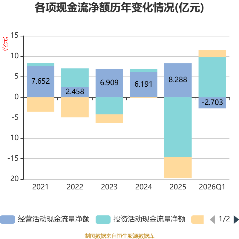 截至2026年一季度末,公司经营活动现金流净额为-2.7亿元,同比增加2002.06万元;筹资活动现金流净额1.71亿元,同比减少1.12亿元;投资活动现金流净额9.79亿元,上年同期为-6.31亿元。