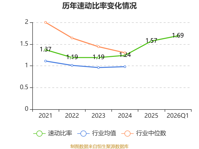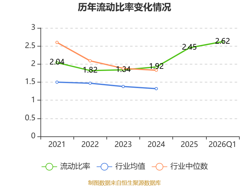 2026年第一季度,公司流动比率为2.62,速动比率为1.69。