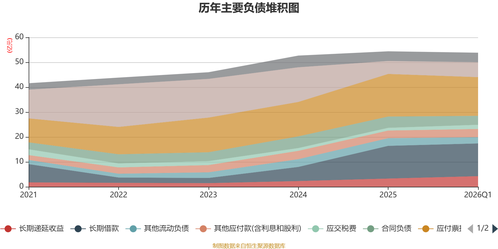 负债重大变化方面,截至2026年一季度末,公司应付票据及应付账款较上年末减少9.16%,占公司总资产比重下降1.06个百分点;合同负债较上年末减少21.5%,占公司总资产比重下降0.64个百分点;长期递延收益较上年末增加29.37%,占公司总资产比重上升0.6个百分点;短期借款较上年末增加15.38%,占公司总资产比重上升0.49个百分点。